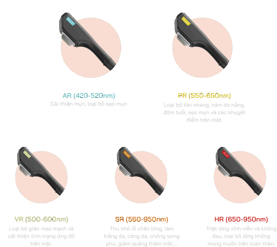 Trang bị 5 đầu điều trị với 5 bước sóng khác nhau, phù hợp cho mọi loại da và đa dạng liệu trình.